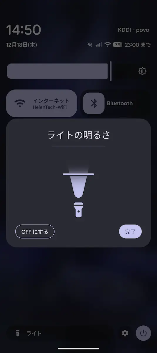 タイルを長押しすると「ライトの明るさ」というダイアログが表示され、上下のスライダーで光の強さを調整できるようになります。