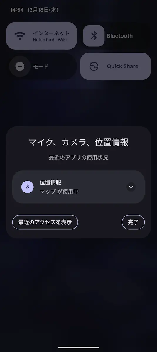 ステータスバーにおける位置情報の使用状況を示すインジケーターが変更されました。これまでは単なるアイコンでしたが、カメラやマイクの使用中と同様に「青いチップ(ドット)」で表示されるようになります。