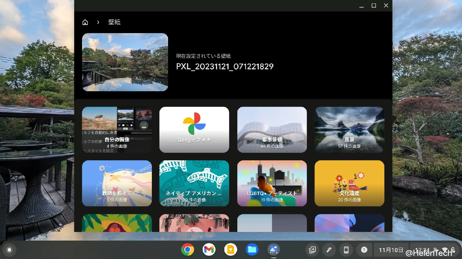 Chromebook では、デスクトップの壁紙として標準で多数のカテゴリが用意されており、好みに合わせて画像を選べるほか、自分の写真を設定することも可能です。