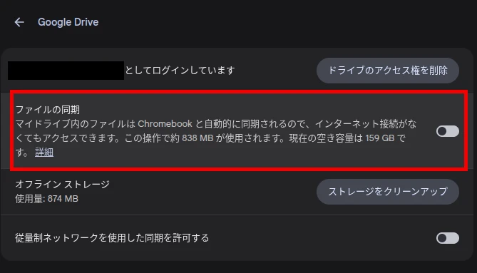Chromebook Plus をお使いの場合は「ファイルの同期」という機能が有効になっている場合があります。