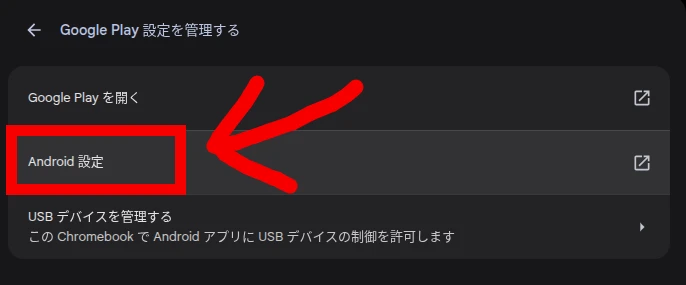 - [アプリ] > [Google Play 設定を管理する] > [Android 設定]