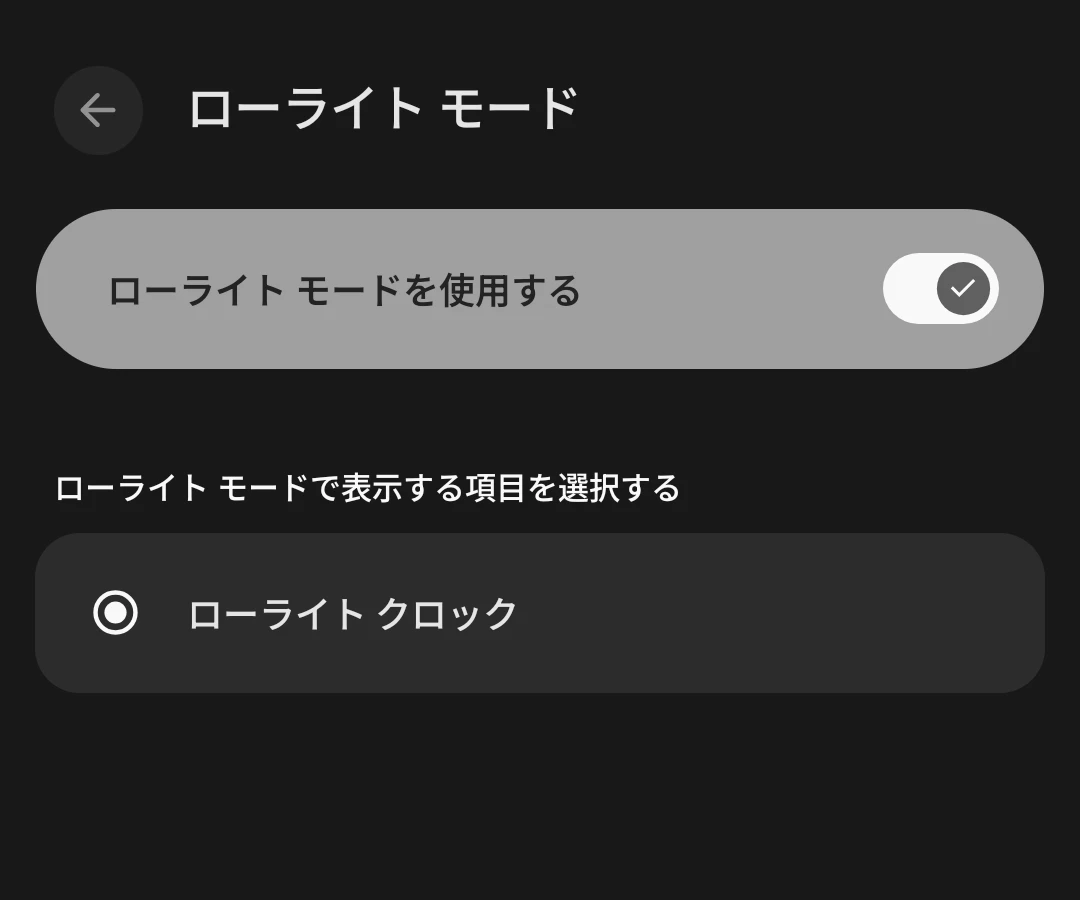 1 つ目の問題は、Pixel 10 Pro シリーズでスクリーンセーバーの「ローライトモード」の挙動を管理する「ローライトモードで表示する項目を選択する」という項目から、「画面 OFF」というオプションがなくなっていることです。