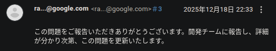 幸いなことに、Issue Tracker のコメントでは Google がこの問題について調査を開始していることが明らかにされています。