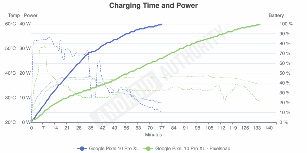 しかし、Android Authority による詳細な検証の結果、Pixel 10 シリーズの Qi2 充電は発熱の影響により、スペックどおりの充電にならないことが確認されています。