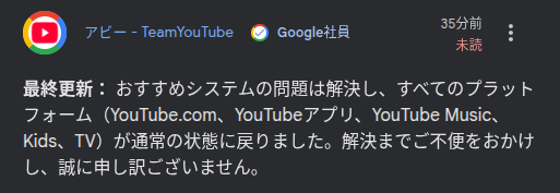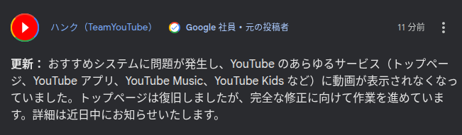 現在、YouTube のトップページなどは復旧しつつありますが、Google(YouTube チーム)は問題を認識しており、完全な修正に向けて作業を継続していると発表しています。