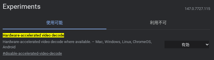 2. 試験運用版機能のページで「Hardware-accelerated video decode」を検索