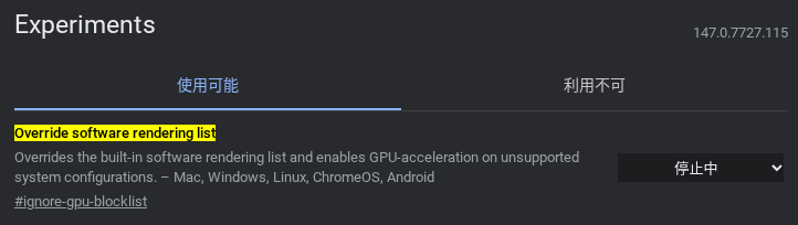 もし、上記のフラグを無効にしても解消しない場合は、「Override software rendering list (#ignore-gpu-blocklist)」というフラグが [無効] または [停止中] になっているかも確認してください。