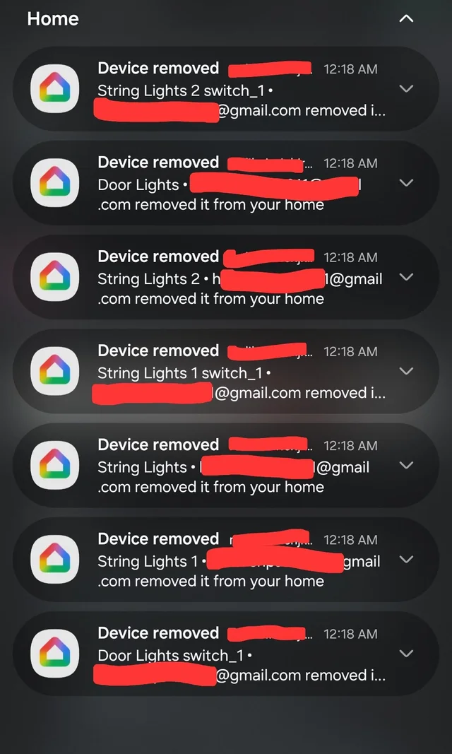 Reddit に投稿されたケースでは、ユーザーが何も操作をしていないにもかかわらず、48 時間以内に複数回、スマートライトなどのデバイスがホームから削除されたという通知が届いたとのことです。