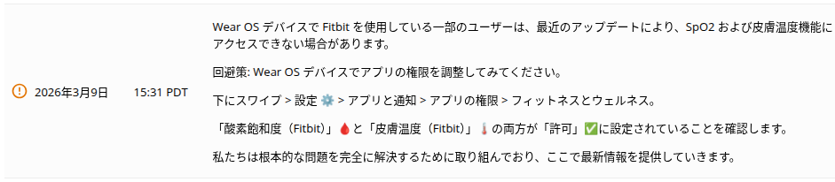 2026 年 3 月の Pixel Watch 向けアップデートを適用した一部のPixel Watchユーザーから、SpO2(血中酸素濃度)および皮膚温度の測定(トラッキング)が機能しなくなったという問題が報告されています。