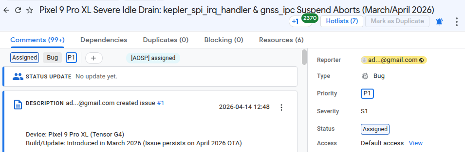 前回の記事でお伝えした時点では、Google からの公式な見解や対応状況は不明なままでしたが、Google の IssueTracker において該当の不具合報告が「Assigned(担当者割り当て済み)」へとステータス変更され、最優先で修正すべき致命的なバグを示す「P1」の優先度が設定されたことが確認されました。