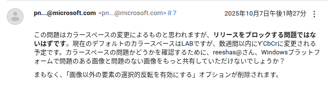 Microsoft のエンジニアによれば、Chrome が画像処理に使用するカラースペースが従来の方式から「LAB カラー空間」に変更されたことが原因とのことです。これにより、画像の反転処理ロジックが誤作動し、通常の画像まで反転されてしまっています。