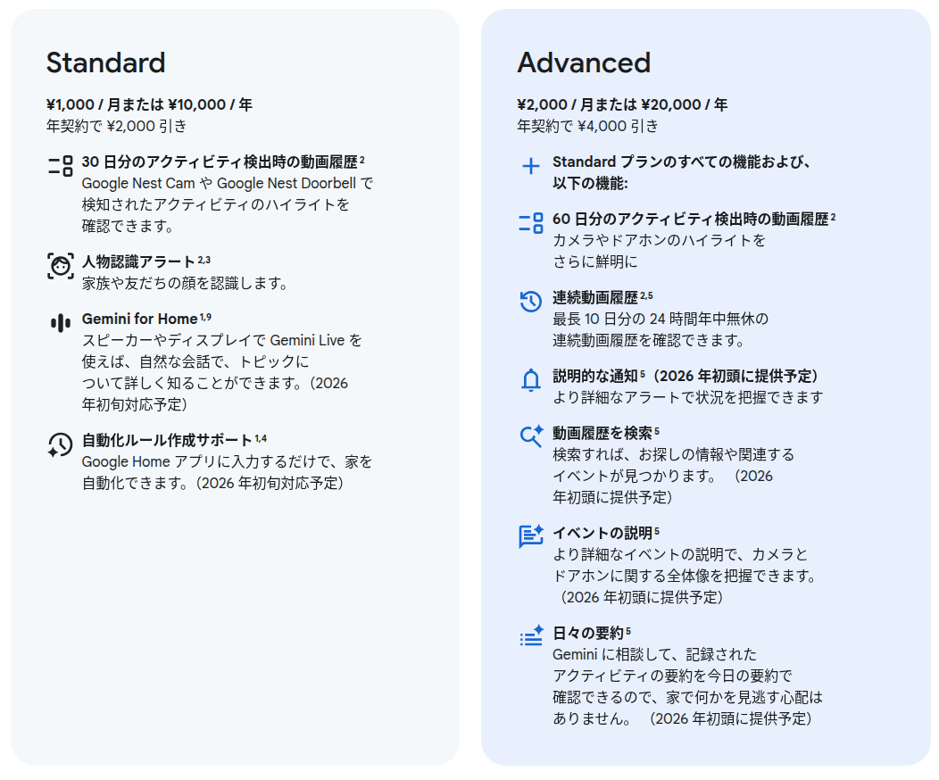 プランは「Standard」と「Advanced」の 2 種類が提供され、ユーザーはニーズに応じて選択できます。既存の Nest Aware ユーザーは、引き続き現在利用中の機能を使用できます。