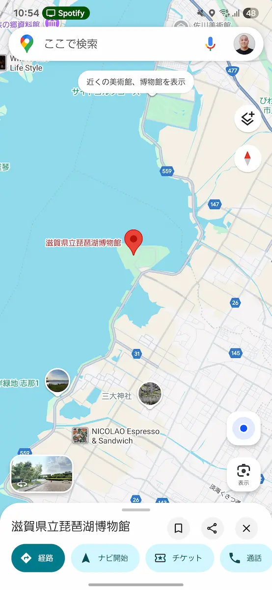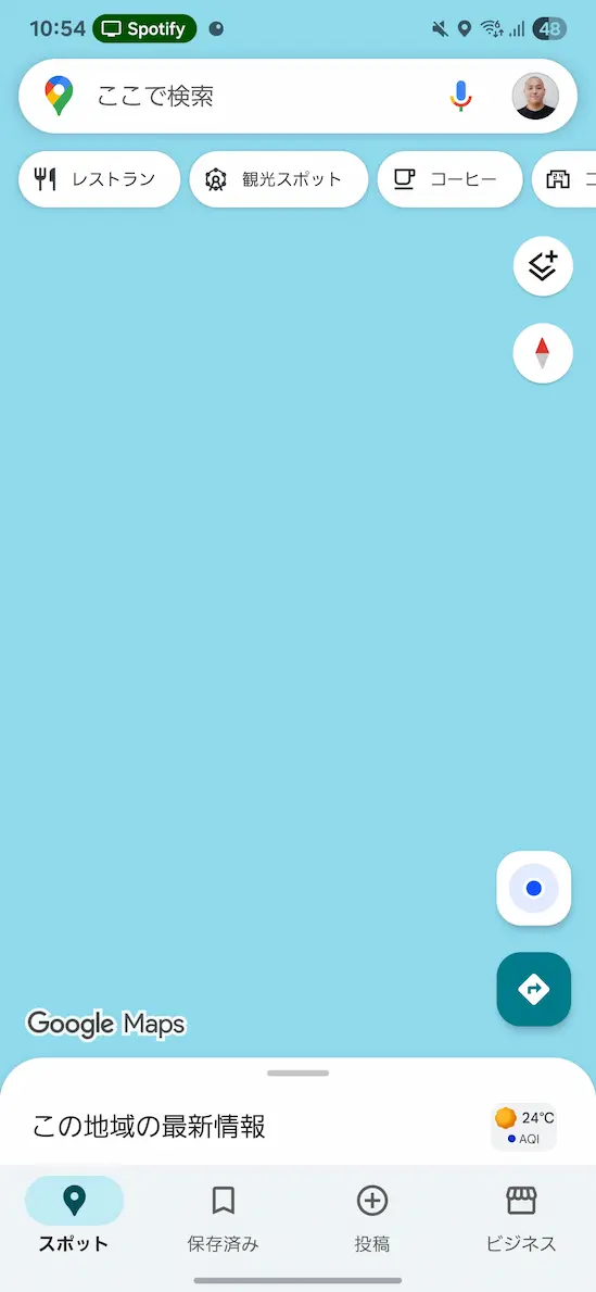 画面右下に表示される青い円形の「経路」フローティングアクションボタン (FAB) が、以前よりも少し小さくなりました。これにより、マップの表示領域がわずかに広がり、よりすっきりとした印象を与えます。