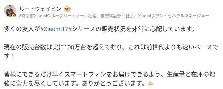 Lu Weibing 氏が Weibo に投稿した内容によると、Xiaomi 17 シリーズは前モデルの Xiaomi 15 シリーズよりも速いペースで販売を伸ばしており、好調なスタートを切ったことがわかります。