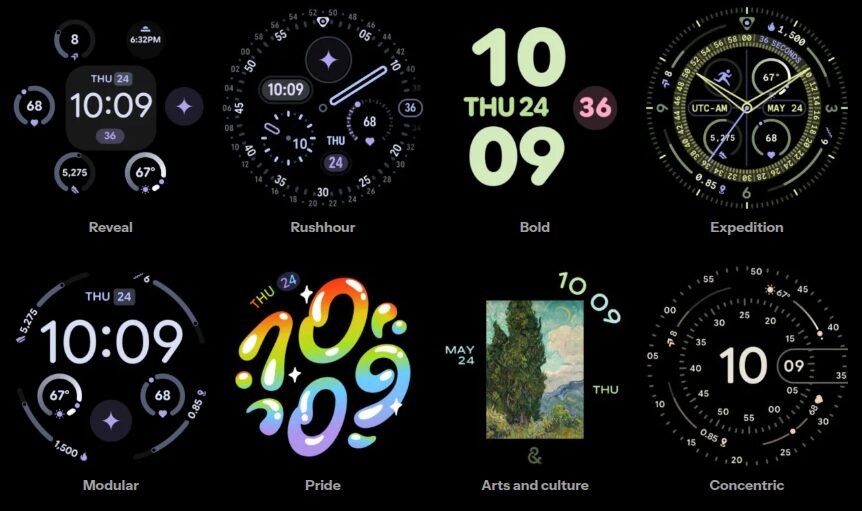 今回明らかになった新しいウォッチフェイスは以下の 8 種類です。