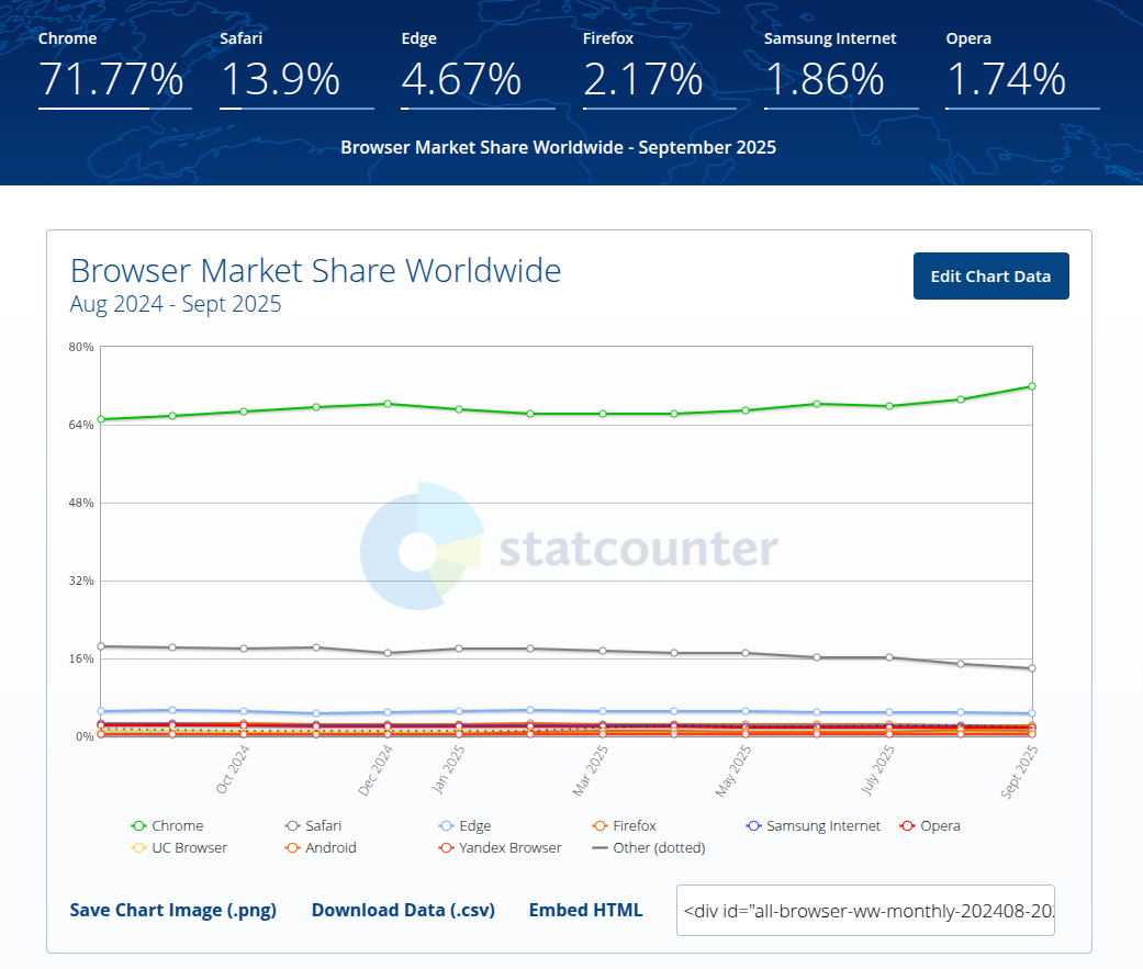Google Chrome のデスクトップシェアが過去最高の 71.86% に到達(〜2025年9月)