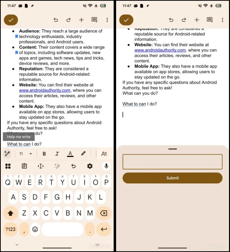 この機能が実装されれば、Gmail の文章作成支援と同様に、モバイルデバイス上でも AI のサポートを受けながら、より効率的に文章を作成できるようになるとみられます。