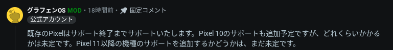 既存の Pixel ユーザーについては、現在サポートされているデバイスは寿命(EOL)まで引き続きサポートされる予定です。Pixel 10 のサポート追加が進められており、Pixel 11 以降については今後検討されるとしています。