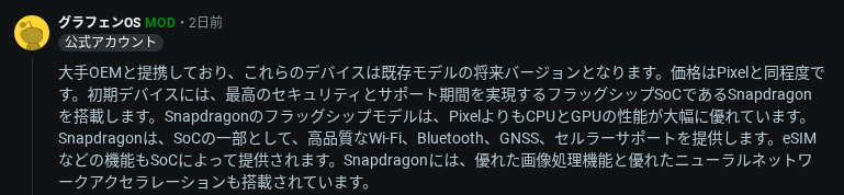 • プロセッサ: フラッグシップクラスの Snapdragon チップセットを採用。GrapheneOS は、Google の Tensor チップと比較して CPU/GPU 性能が大幅に向上していると説明しています。