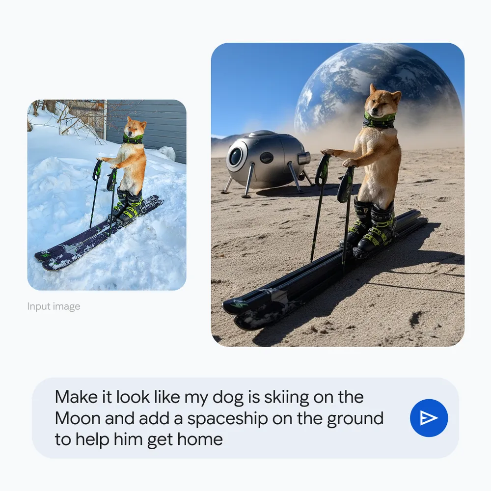 - 現実離れした編集: 「月面でスキーをする犬」といった、現実にはありえないユニークな合成写真を簡単な指示で作成できます。