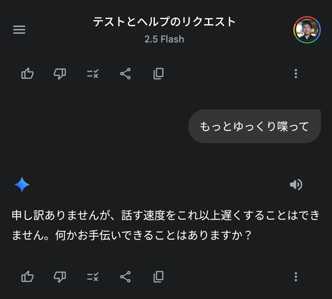 ユーザー側から Gemini の話し方を制御することも可能です。以下のような設定を会話の途中で変更できます。