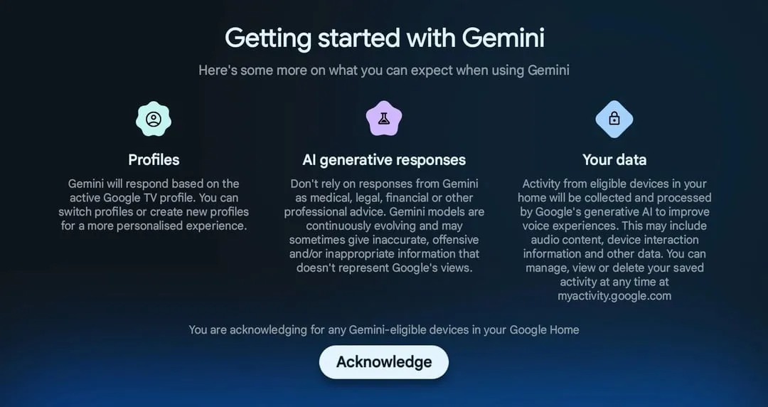 Google TV において、Google アシスタントの後継となる AIアシスタント Gemini への置き換えが進められていますが、一部のユーザーにおいて予定よりも早く Gemini が利用可能になったことが報告されています。これにより、セットアップ画面や音声選択肢の詳細が明らかになりました。