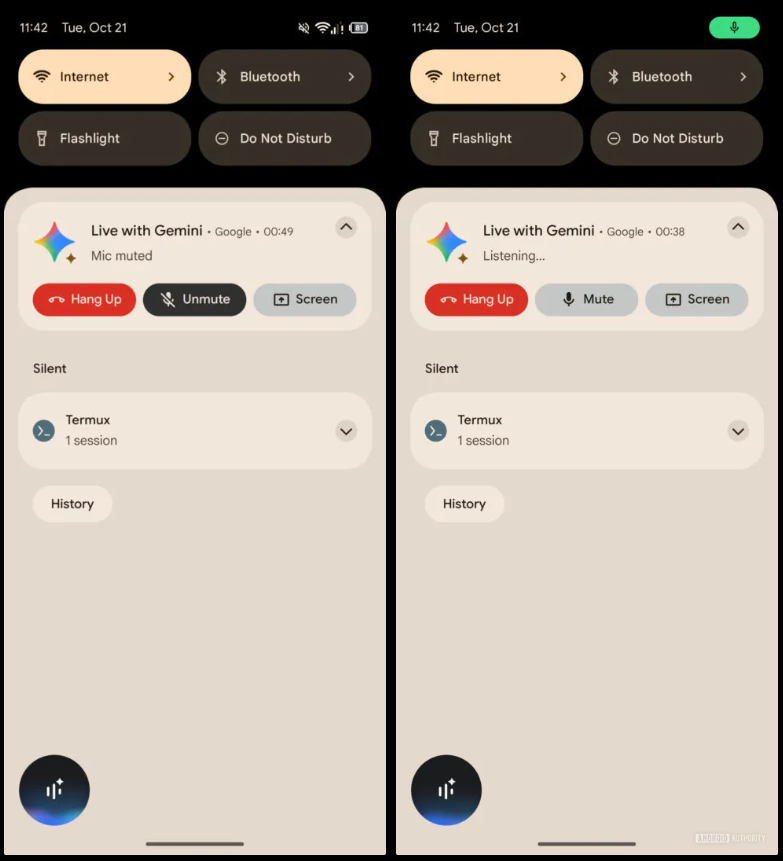 今回発見されたミュートボタンは、Gemini Live の会話画面と通知内の両方に表示されます。