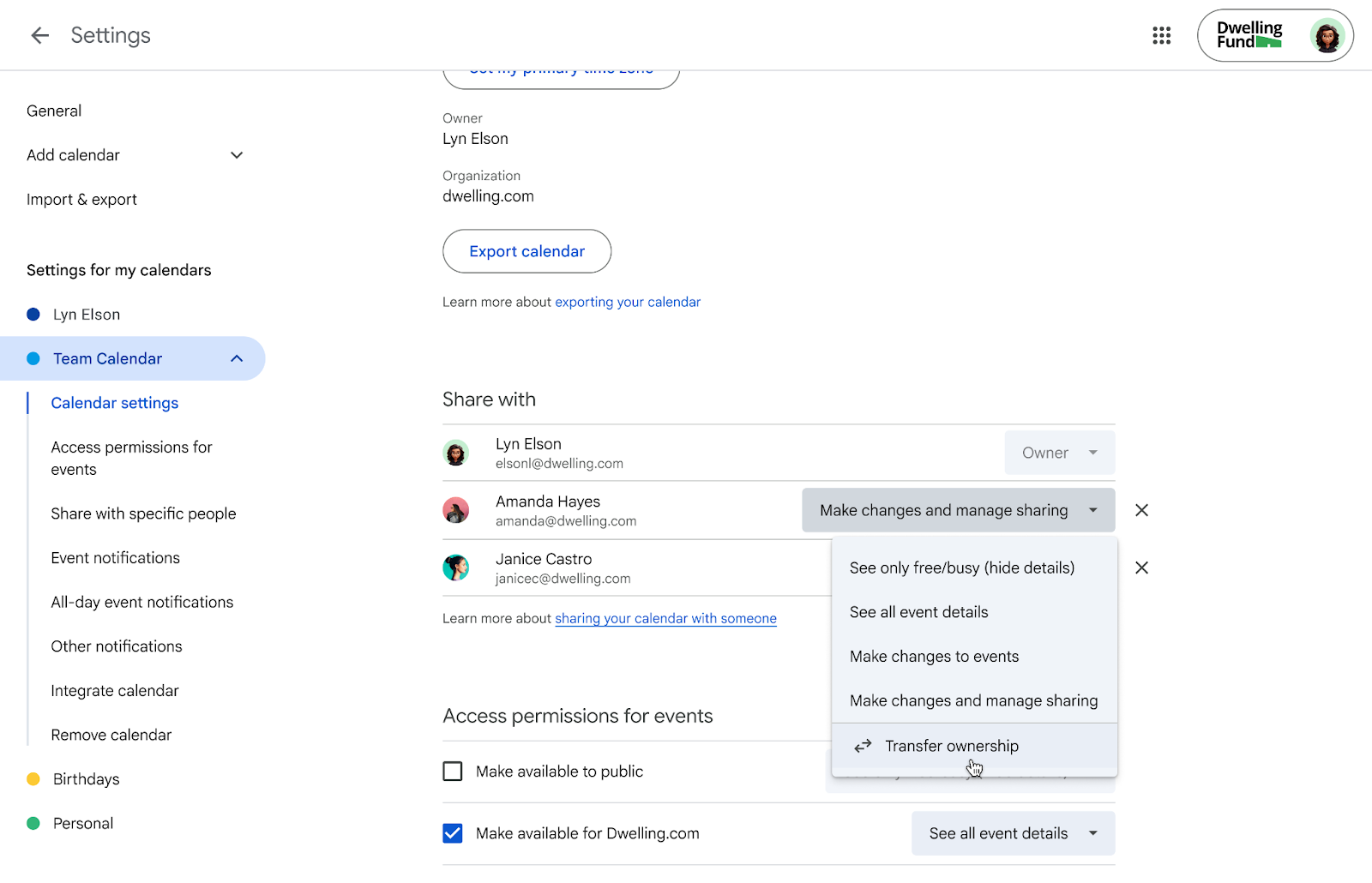 ユーザー自身は Google カレンダーの設定画面から、管理者は Google 管理コンソールからオーナーを変更できます。