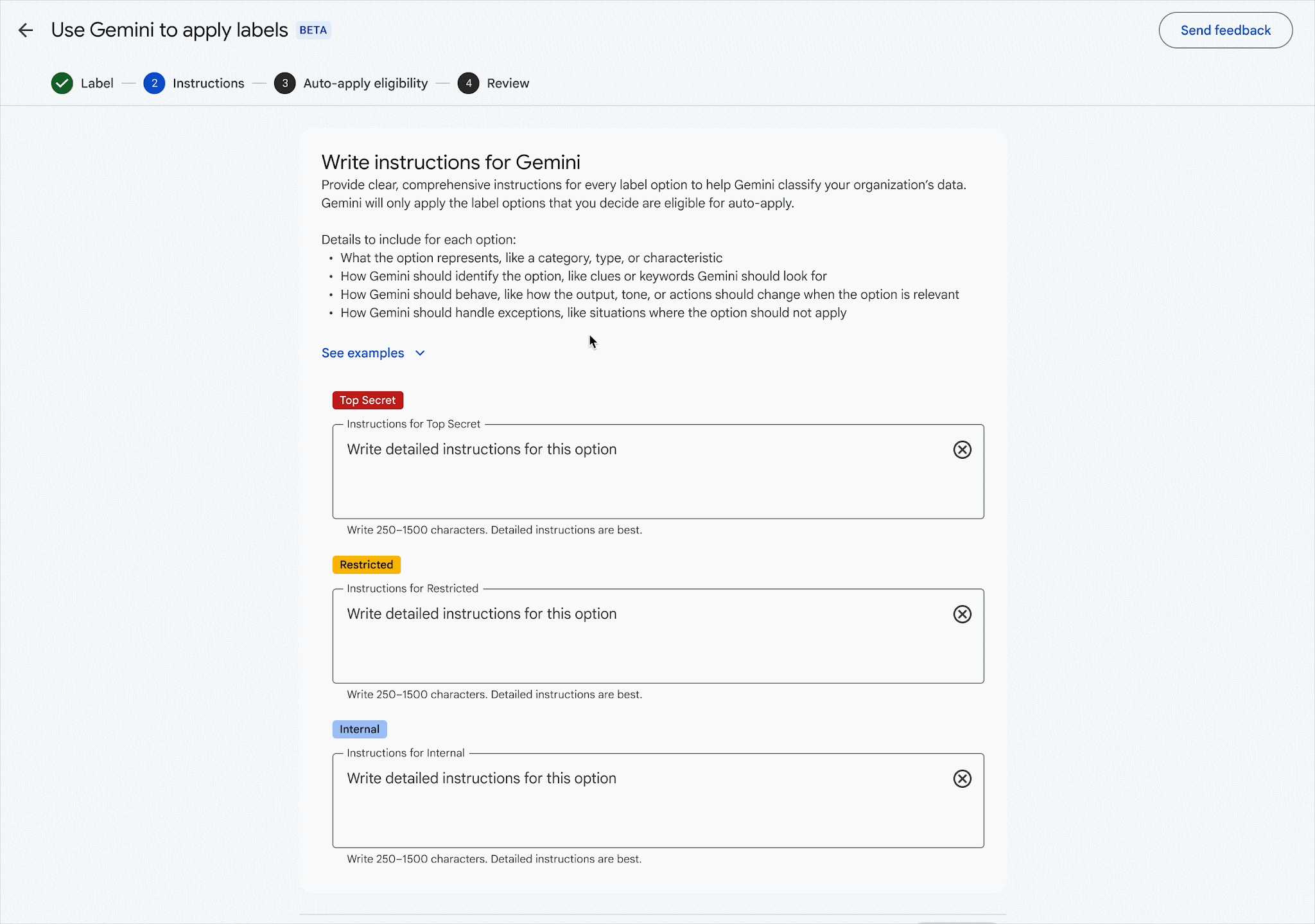 今回のアップデートでは、管理者が分類の目的や方針をプロンプトとして入力するだけで、Gemini モデルがファイルを評価し、適切なラベルを自動適用します。