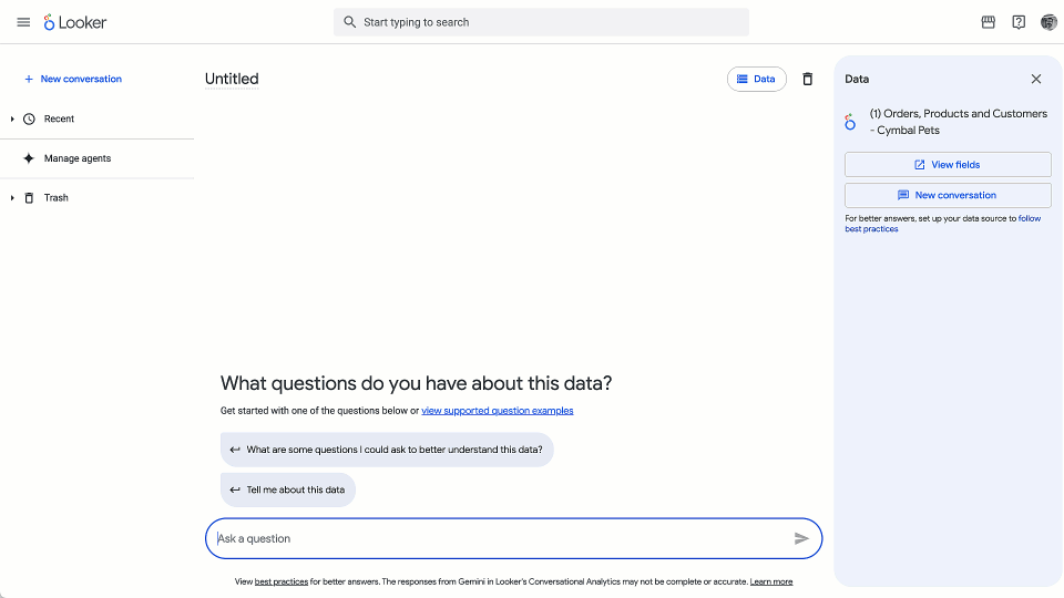 正式版では、最大 5 つの Looker Explore(事前結合済みのデータビュー)を統合し、複数のビジネス領域にまたがる質問も可能になりました。