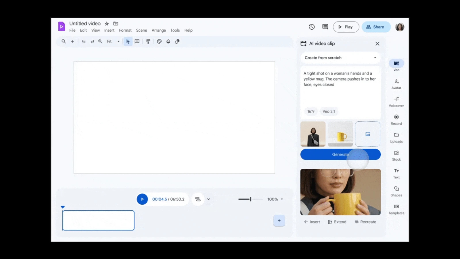 Google は、Google Workspace 向けの動画作成ツール Google Vids において、Veo 3.1 を活用した新機能「ingredients-to-video(画像から動画生成)」を提供開始しました。
