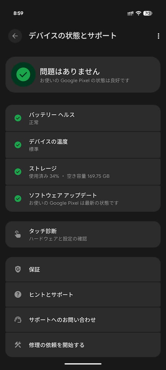 「デバイスの状態とサポート」は、Pixel の状態確認に必要な情報を一つにまとめてくれる便利なダッシュボードです。