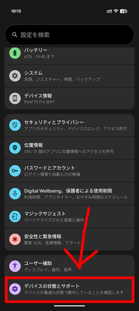 このページにアクセスするには、Pixel デバイスで [設定] アプリを開き、画面を下にスクロールして一番下にある [デバイスの状態とサポート] をタップします。