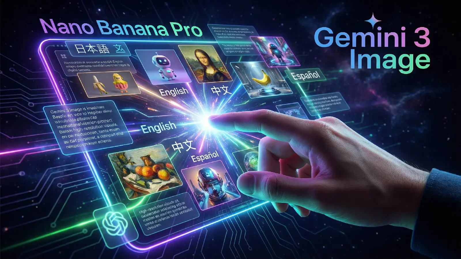 - Text Integration: AIインターフェースの画面に「Nano Banana Pro」、「Gemini 3 Image」といったテキストが、未来的なフォントで鮮明に表示されている。