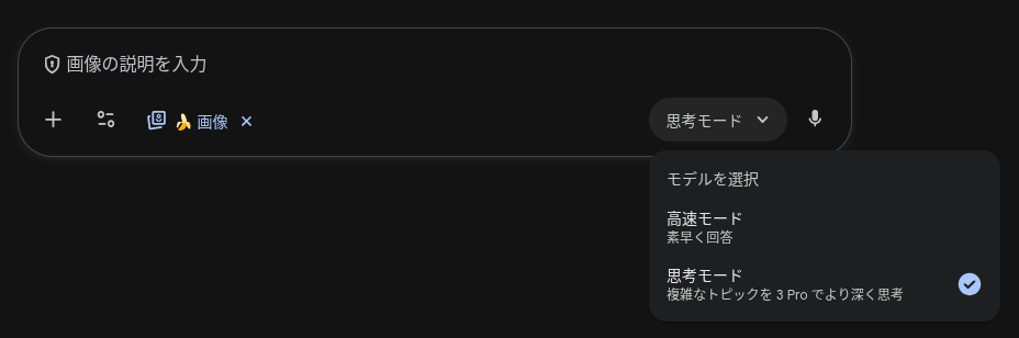 ただし、画像生成時には Gemini 3 Pro を利用できる「Thinking (思考モード)」にする必要があります。「Fast」のままでは従来モデルの挙動になり、アスペクト比の指示などを無視するなどが発生するため注意してください。
