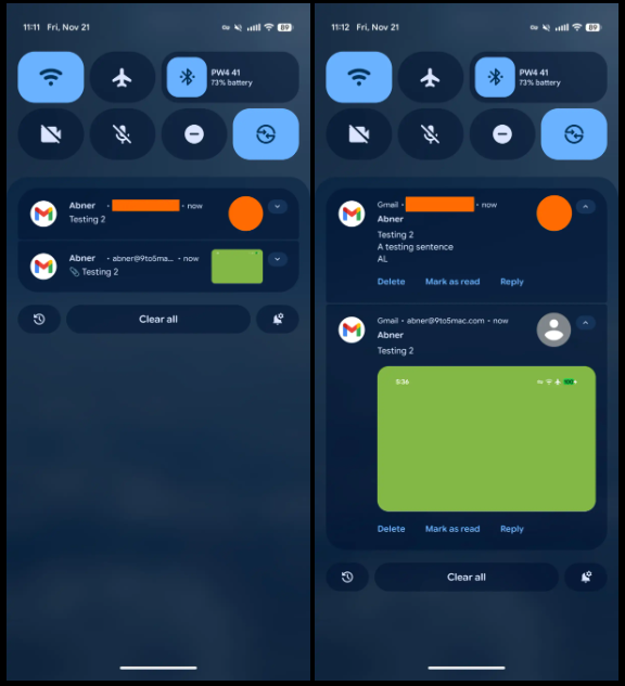 9to5Google によれば、今回の変更では Gmail の通知に添付ファイルがある場合、コンパクトな通知表示では件名の前にクリップのアイコンが表示され、右側の送信者アイコンが小さな添付メディアのプレビューへと置き換わります。