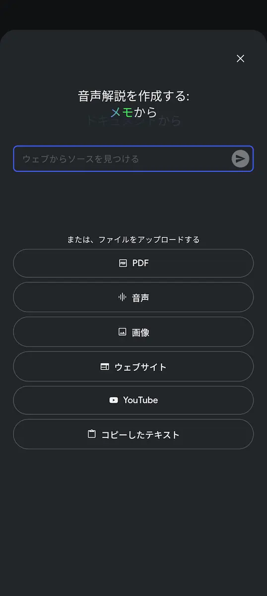 これにより、これまでのテキスト・音声・動画・Web サイト・PDF に加えて、保存された画像と、手書きのメモやホワイトボード、印刷された資料などをその場で撮影してソースとして読み込めるようになっています。
