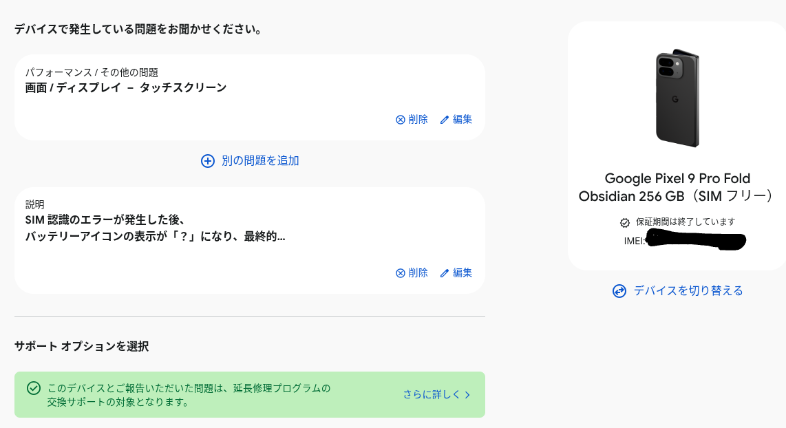 なお、記事執筆時点では筆者の Pixel 9 Pro Fold の IMEI を入力しても「保証期間は終了しています」と表示されていましたが、サポートオプションを進めたところ、「このデバイスとご報告いただいた問題は、延長修理プログラムの交換サポートの対象となります」と表示されました。