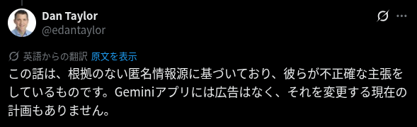 同氏によれば、「Gemini アプリには現在広告はなく、これを変更する計画も現時点では存在しない」としており、報道が「根拠のない匿名の情報源」に基づくものだと批判しています。