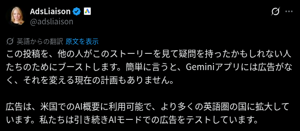 また Google 広告の広報アカウント AdLiaison も同様に、Gemini アプリ内の広告導入について「計画なし」と強調しました。