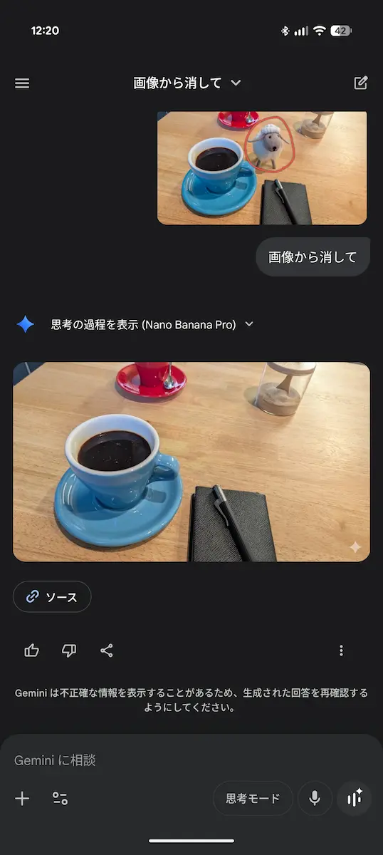 なお、この機能の画像編集には Nano Banana Pro が必要になるため、「思考モード (3 Pro を搭載)」を選択する必要があります。