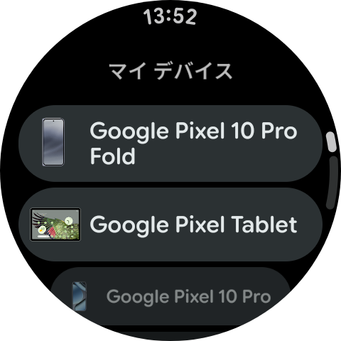 実際に筆者の Pixel Watch 4 でも利用可能になっており、新しい「Find Hub」アプリを起動すると、Google アカウントに紐付いているすべてのデバイスが「マイデバイス」リストとして一覧表示されます。