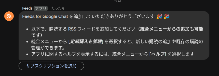 Google Workspace Marketplace から「Feeds」アプリをインストールし、チャット内の統合メニュー(コマンド)から設定を行います。