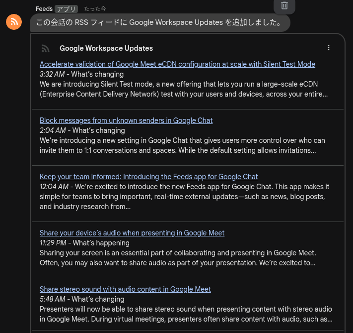 Google チャットに公式の RSS/Atom フィード連携アプリ「Feeds」が登場しました。外部のニュースやブログの更新を自動でチャットに流すことができ、チームでの情報共有や議論がよりスムーズになります。