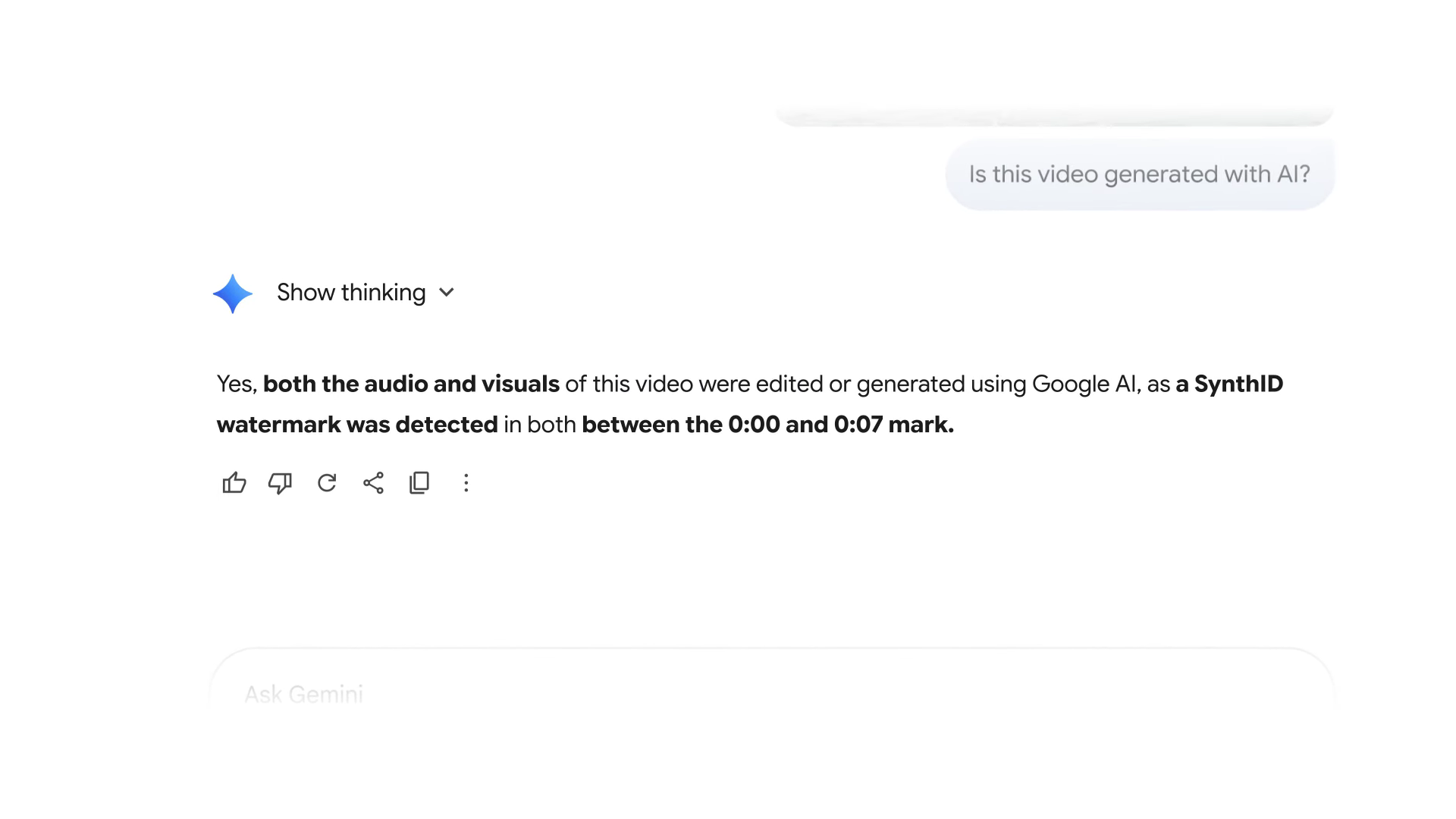 Gemini は動画の映像トラックと音声トラックの両方をスキャンし、 SynthID の有無を確認した上で、独自の推論に基づいた回答を提示します。