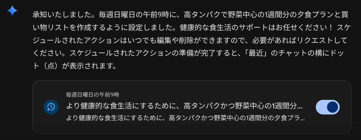 具体的な日時を指定している場合、単なる応答ではなく毎朝プランを作成するための「予約アクション」が表示されます。