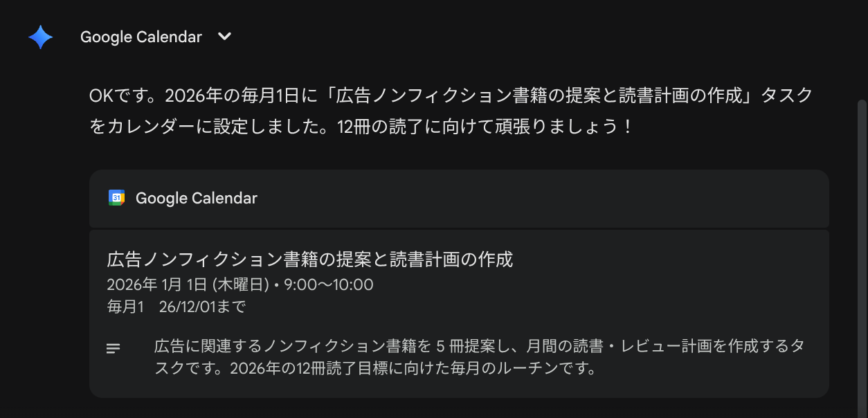 Gemini は、Google Workspace や他の Google アプリと連携できるため、単にテキストでアドバイスをもらうだけでなく、実際のデータを読み込ませたり、スケジュールに直接予定を組み込んだりすることが可能です。