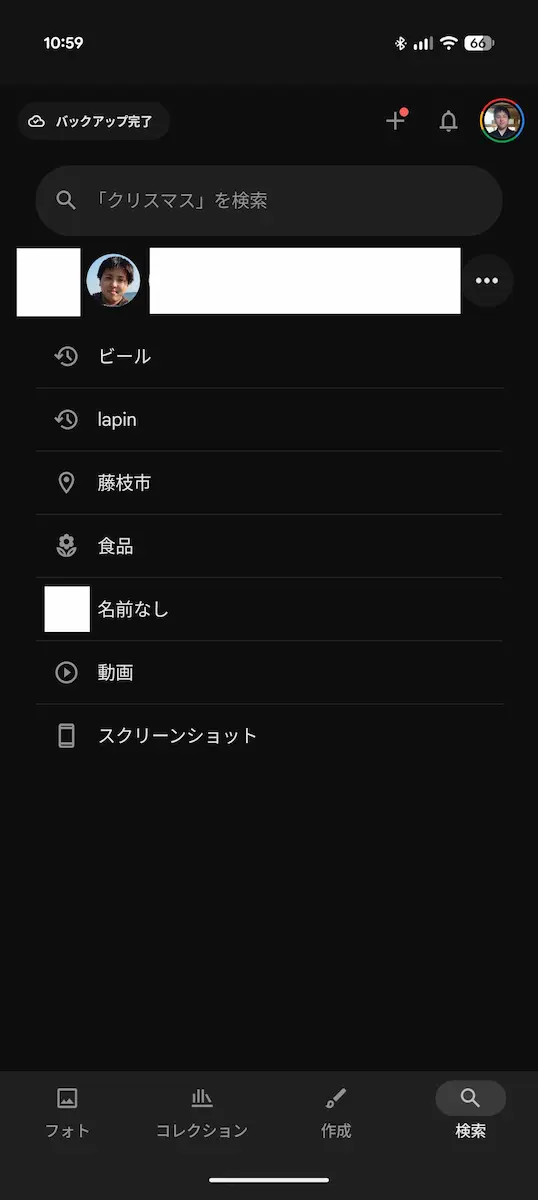 今回のアップデートにより、Google フォトアプリの「検索」タブ(質問機能が有効な場合は「質問」タブですが、日本では展開されていません)を開くと、ユーザーが設定した「フェイス グループ」に基づく顔アイコンの列が目立つ位置に表示されるようになります。