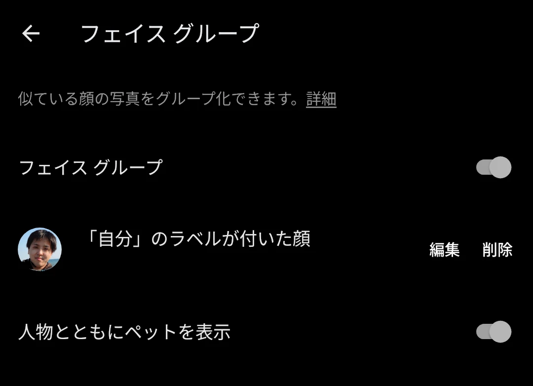 この機能を利用するには、Google フォトの設定で「フェイス グループ」が有効になっている必要があります。