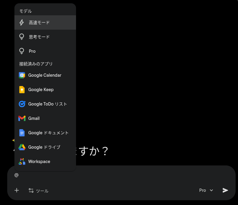 選択後は入力欄に @高速モード、@思考モード、@Pro と表示され、その対話で使用されるモデルが固定されます。